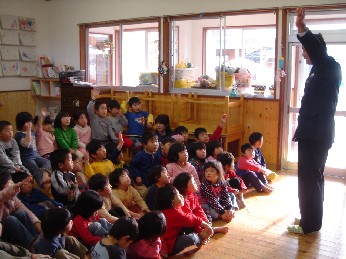 一武駐在所のおまわりさんに来ていただいて、交通安全のお勉強をしました。信号、踏み切りの渡り方などわかりやすく教えていただきました。