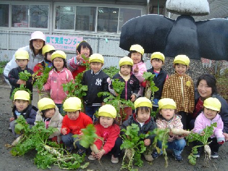 バンビ組のお友達は、明日の給食のおでんの材料の大根を保育園の畑に行って収穫しました。とても形のいい大根にみんなは大満足。明日の給食が楽しみだなあ。