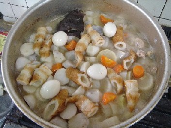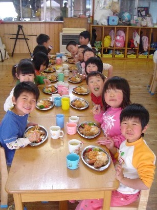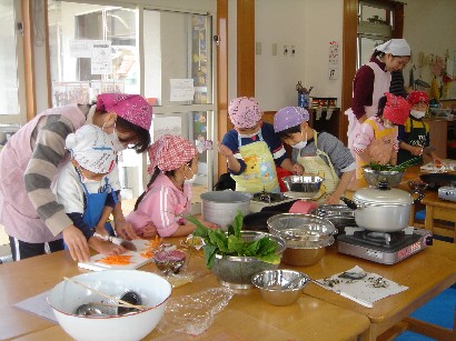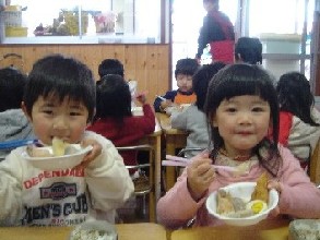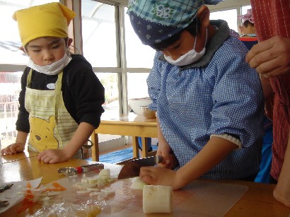昨日バンビ組のお友達が収穫した大根は、サトイモ、にんじん、卵、ちくわ、鶏肉などと一緒におでんの鍋の中です。給食室からとってもいいにおいがしてきていますよーっ!