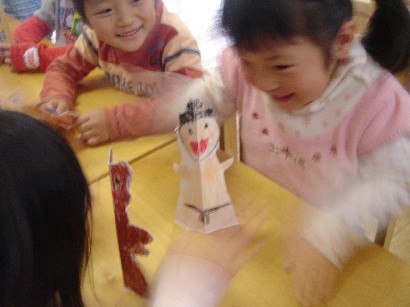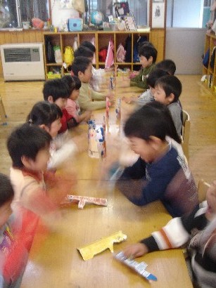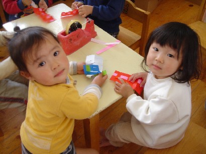 またまた雨の日です。ぞう・パンダ組のお友達は牛乳パックを使っておすもうさんを作りました。