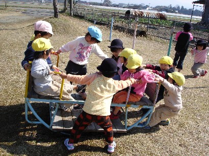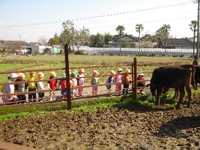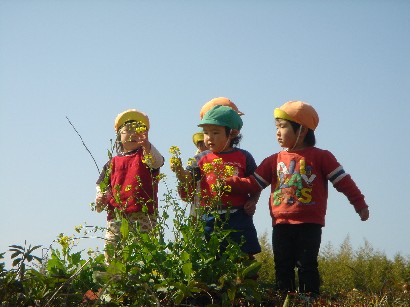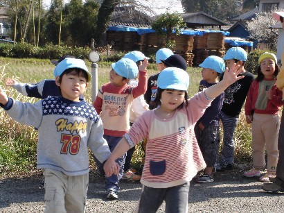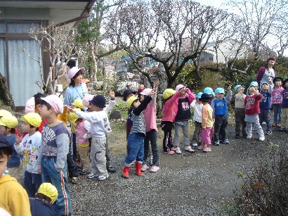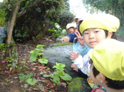 ようやくお日さまが顔を出してくれました。今日はぽかぽか小春日和。ばんび、パンダ、ぞう組のお友達は春を探しにでかけました。あった、あった!園長先生のお庭で見つけました、ふきのとう。