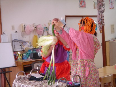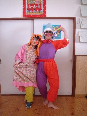 今日は2月生まれのお友達のお誕生会でした。お祝いにオレンジ色の髪をした女の子とピエロのピーちゃんがやって来て、ゲームや手品で楽しみました。