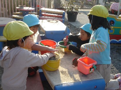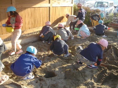 おうちの方がお迎えに来られるまで、こんなふうに待っていまーす 砂場で穴をほったり、山を作ったり、砂をどこかに運んだり・・・
