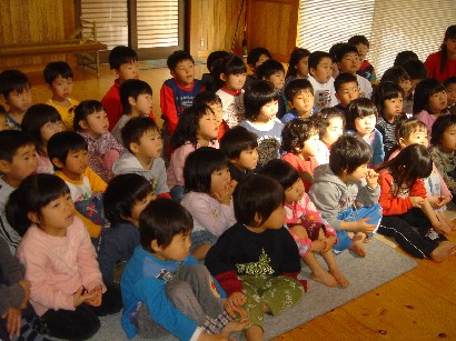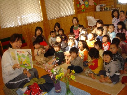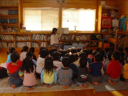 今日は「みんなのへや」で行われる「おはなしの会」の日です。まずは未満児・りす・あひる・ひよこ組のお友達のためのおはなしの会が始まります。今日はどんな絵本が登場するかなあ