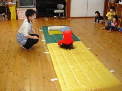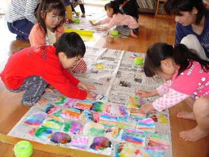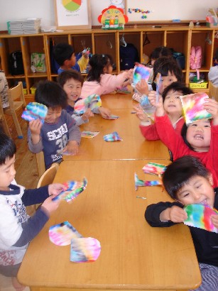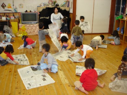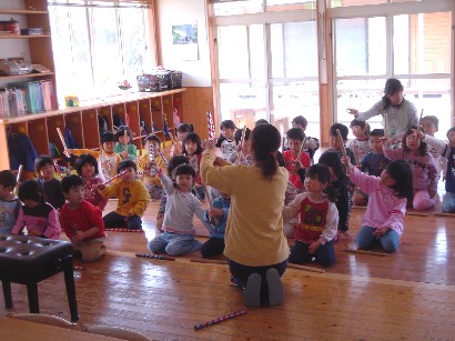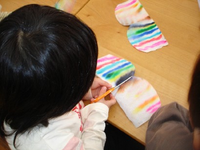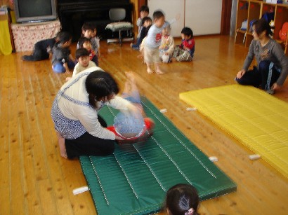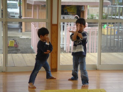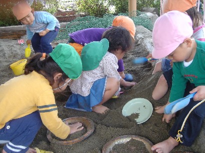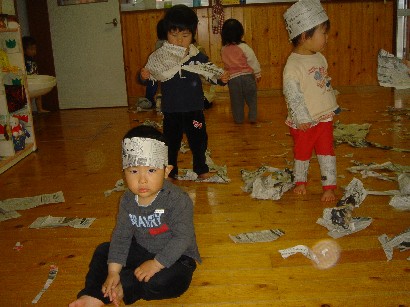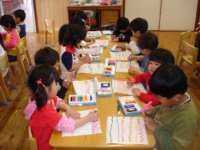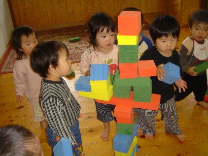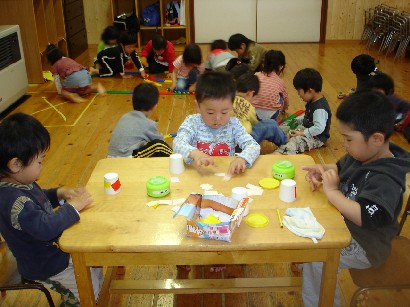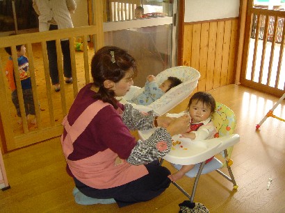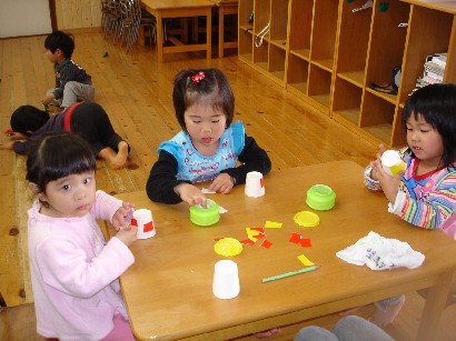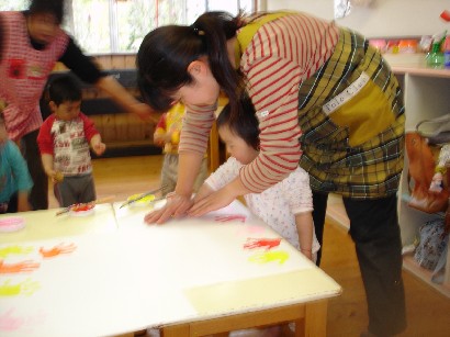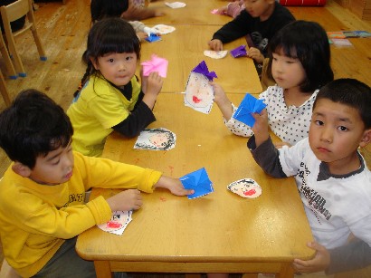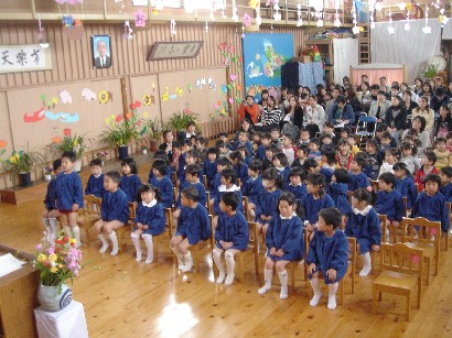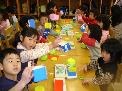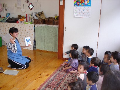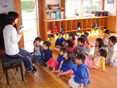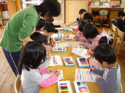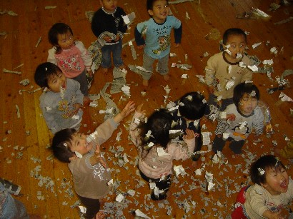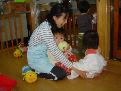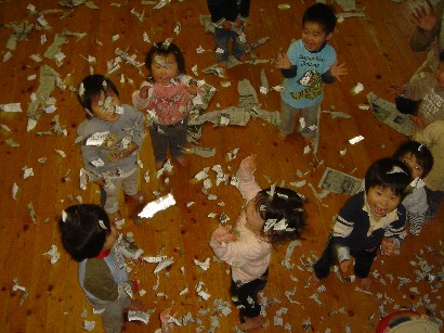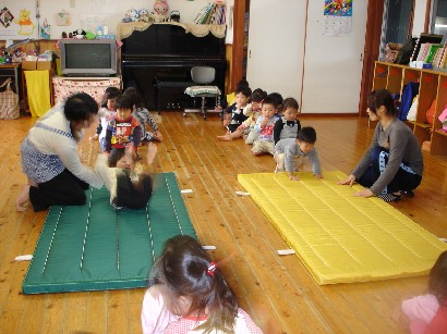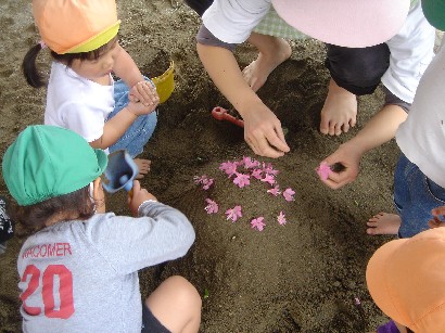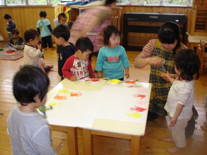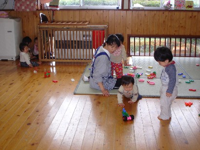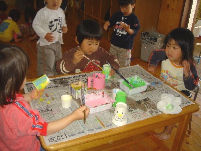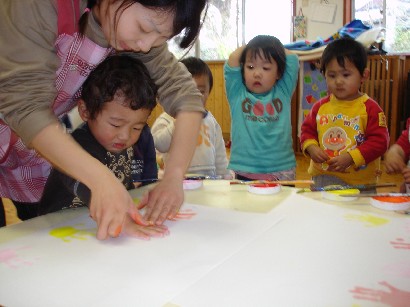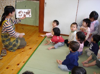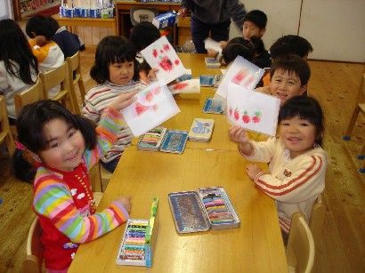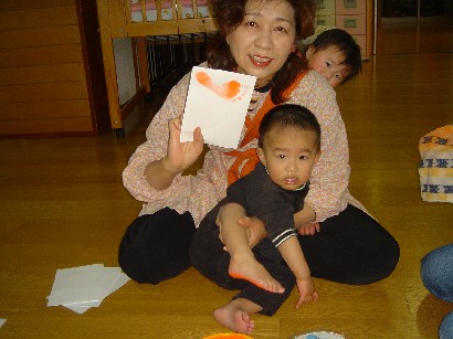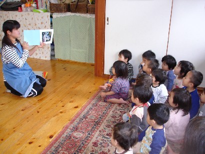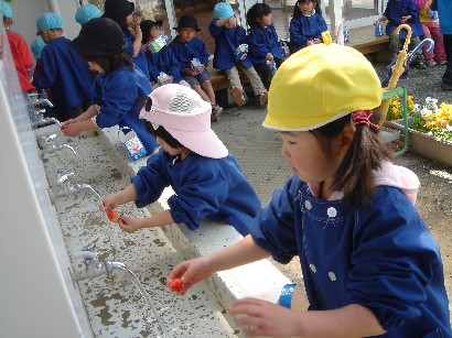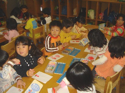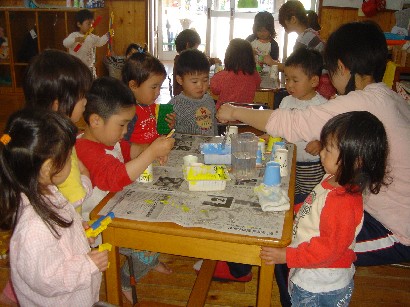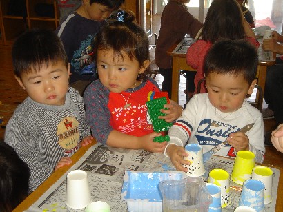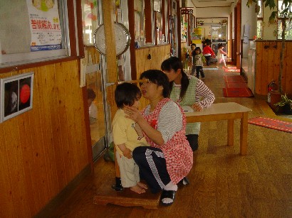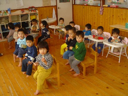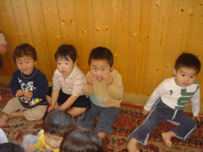 | 保育園からもらったお賽銭をひとりひとりお釈迦様の前にあげて、先生にお釈迦様の頭に甘茶をかけてもらい、「おりこうさんになりますように」「病気をしませんように」と祈ります。 |